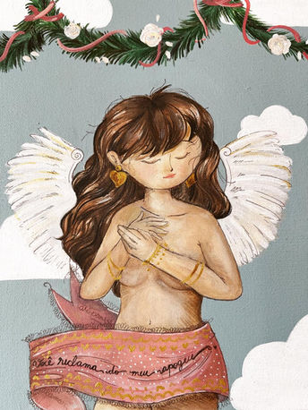 Desenvolvo obras autorais com estilo e conceito próprios, criando figuras femininas personalizadas (sem feições identificáveis) dentro de uma estética lúdico-romântica, com elementos como flores, passarinho gordinho, estrelas, anjos, arabescos e símbolos poéticos. A paleta é predominantemente rococó e em tons pastéis, resultando em peças com atmosfera onírica, pensadas para transmitir encanto, conforto e leveza.